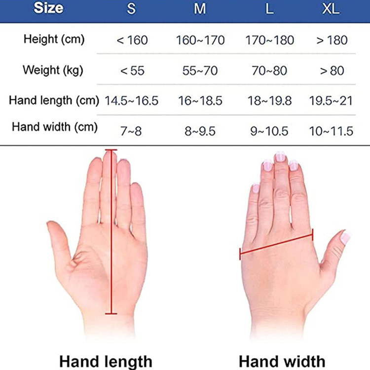 دستکش ها سایز XL ایکس لارج میباشد مناسب دست با طول 19.5 الی 21 سانتیمتر و عرض دست 10 الی11.5 سانتیمتر